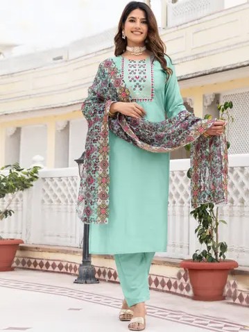 A sophisticated grey silk suit with delicate embroidery. Paired with a matching dupatta, this ensemble blends elegance and grace for a timeless look.