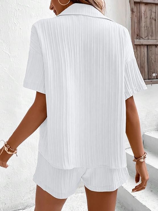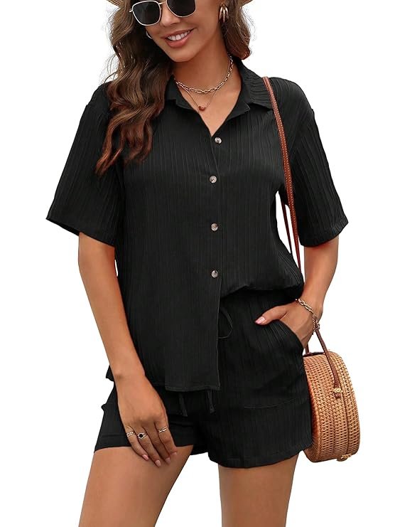 hasmi Women & Girls Black Solid Color Button Front Vacation Solid Texture Short Sleeve Loose Fit Drop Shoulder Pocket Shirt and Shorts Casual Two-Piece Set