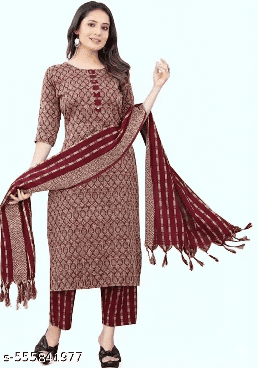 Elevate your everyday ethnic style with this charming Geometric Print Kurta Set. This three-piece set features a kurta adorned with an intricate oval lattice pattern and button details, paired perfectly with contrasting striped pants and a matching dupatta finished with stylish tassels. Crafted for comfort, it’s an ideal choice for office wear or casual outings.