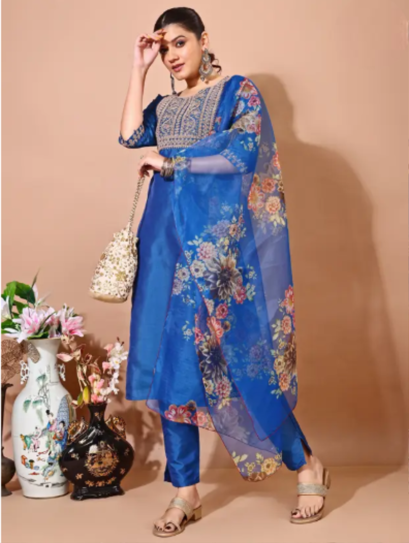 Make a bold statement kurta set. The sleeveless kurta features a striking high-contrast abstract floral print, offering a modern and artistic look. It is paired with matching printed trousers for a coordinated, contemporary ensemble, perfect for casual outings or summer wear.