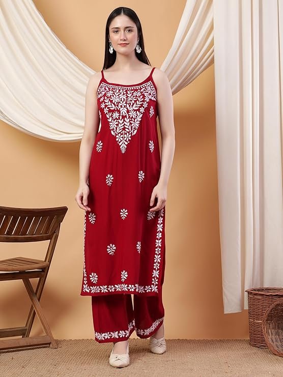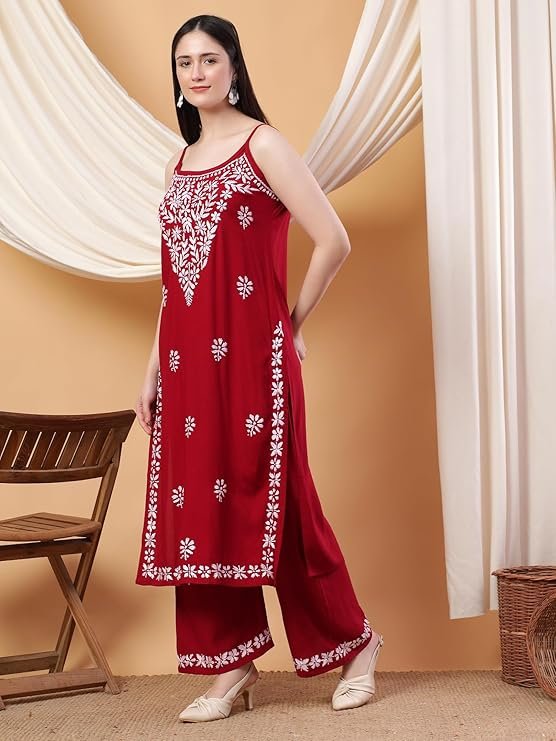 Women’s Hand Embroidered Lucknowi Chikankari Noodle Strap Rayon Co-ord Set